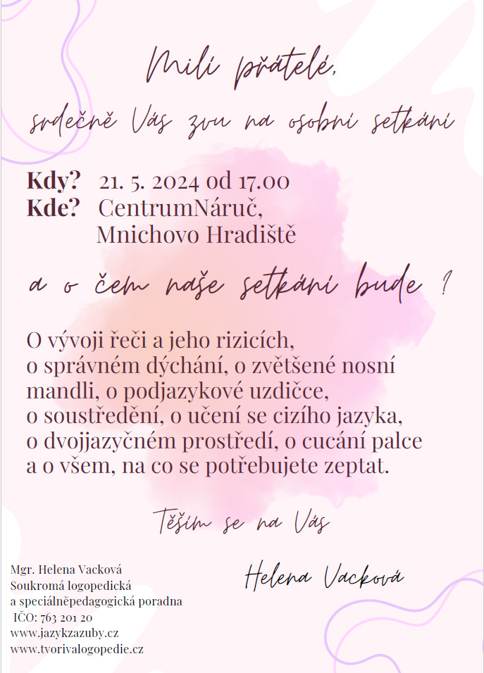 O vývoji řeči a jeho rizicích, o správném dýchání, o zvětšené nosní mandli, o podjazykové uzdičce, o soustředění, o učení se cizího jazyka, o dvojjazyčném prostředí, o cucání palce a o všem, na co se potřebujete zeptat.